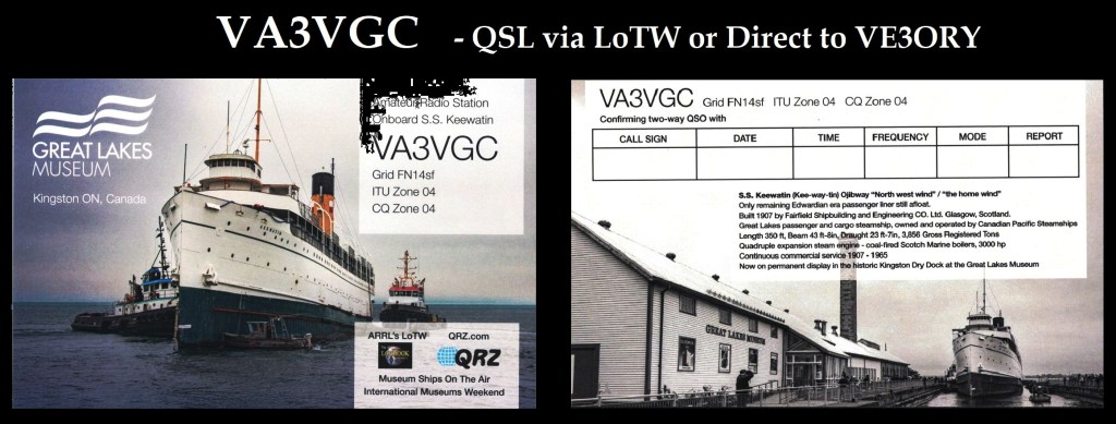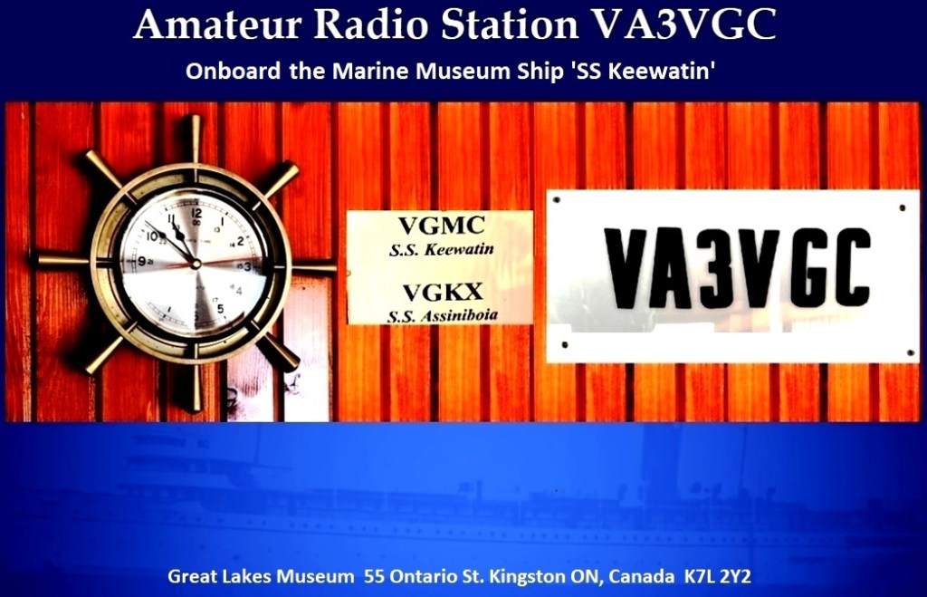 While on display as a museum ship at her home base in Port McNicoll, an amateur radio station was established and operated under the call sigh VA3VGC. The folks at Port McNicoll have kindly granted continued use of that call sign for SS Keewatin at her new retirement home here in Kingston. Sponsorship of the VA3VGC call sign was originally transferred through ISED to Ron Walsh VE3GO, and then subsequently transferred, and currently held by myself VE3ORY.